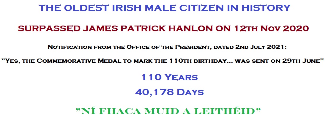- ↑ “THE OLDEST IRISH MALE CITIZEN IN HISTORY”. Ireland's Oldest People. 2025年11月23日確認。