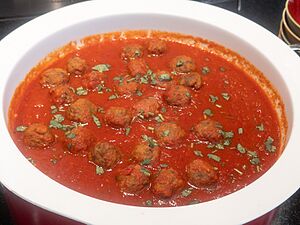 豆、ズッキーニ、カボチャ、ニンジン、カブ、パプリカといった野菜をいっしょに煮込むこともあり、クスクスにかけて食べたり、パンでソースをすくって食べる。
