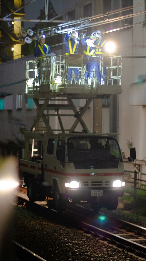 深夜に架線の点検をする保線用の車両。2019/4/23 メーデー!:エンペディアの真実と真相 (トーク)撮影。
