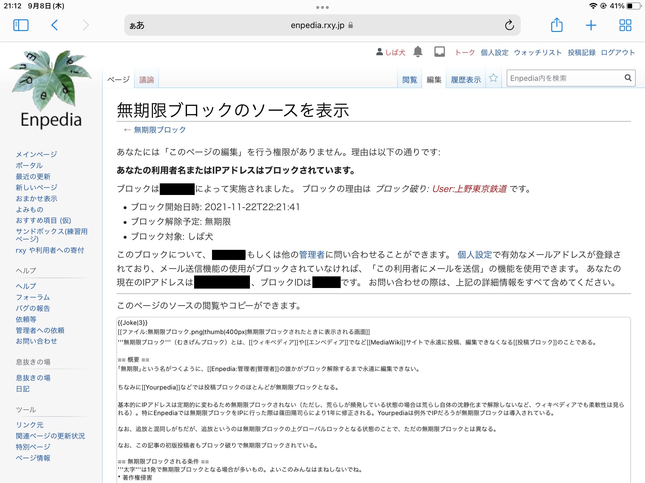 | 2022-09-10T00:24:41 | 2,160 × 1,620 (246キロバイト) | そらまめ (トーク | 投稿記録) | {{User|そらまめ}}氏がエンペディアで無期限ブロックされたときの画像をスクリーンショット、加工したもの。 |