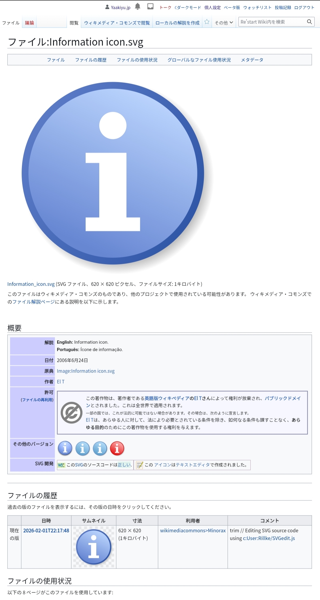 | 現在の版 | 2026-02-25T17:50:15 | 1,080 × 2,023 (501キロバイト) | Yaakiyu.jp (トーク | 投稿記録) | ~~~がmh:restart:file:Information icon.svgのレガシーベクター外装での表示をスクリーンショットしたもの。元アイコンはPDにて提供されているが、MediaWiki外装のスクリーンショットはライセンスがCC BY-SA 4.0のものしか見当たらなかった(例1 例2)ためそのライセンスで投稿。 |
