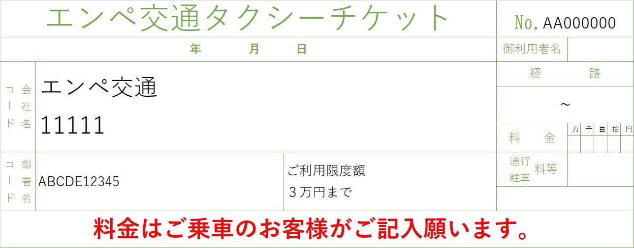 | 現在の版 | 2026-02-16T15:18:39 | 1,288 × 505 (104キロバイト) | 薄味炒飯にカレー (トーク | 投稿記録) | タクシーチケットを再現したもの。~~~が作成。 カテゴリ:タクシー |