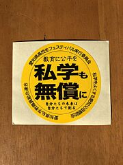 | 2019-11-30T13:59:33 | 「私学も無償に」ステッカー.jpeg (ファイル) | 927キロバイト | 愛知県高校生フェスティバル実行委員会、私学をよくする愛知父母懇談会、愛知県私学教職員組合連合が、各種のフェスで使う。 個人撮影 | |