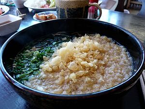 関西では「きつねうどん(けつねうろん)」に対して蕎麦をいうこともあるとか。天麩羅そば・うどんに対して「種抜き」から「たぬき」とされたという説もある。種物の場合は天かすが出て、ときに自然発火して火災の原因となるため、「天かすは客がかけ放題」という店もある。「もり」と白飯を頼んで天かすをかけて麺つゆをかけると「悪魔のおにぎり」になるという話もある。