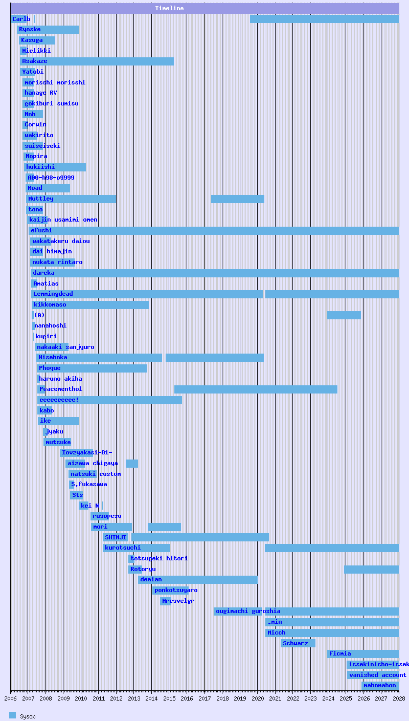 jaucp:Uncyclopedia:管理者のデータをもとに、就任日順にグラフ化。技術的な都合で仮名漢字が利用できないため、仮名漢字のユーザー名はローマ字に直し、頭文字を小文字にした(英字の場合はシステム上頭文字が大文字になるので区別できる)。